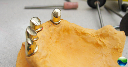 Eine hochwertige prothetische Versorgung beim Zahnersatz ist die Teleskop Doppelkrone. Die Befestigung der Prothese wird mittels des Doppelkronen Prinzips gewährleistet. Das heißt, die Brücke oder der Zahnersatz wird an geeignete Restzähne befestigt. Diese werden beschliffen und mit eine Metallkrone versehen, die fest mit dem Restzahn verbunden wird. Die sogenannte Primärkrone ist später für den Sitz und den Halt des Zahnersatzes verantwortlich. Die Sekundärkrone (des eigentlichen Zahnersatz) wird später als herausnehmbare Prothese mit der Metallkrone verbunden.